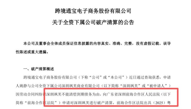 近日,深圳大卖跨境通披露重要公告,其全资子公司深圳飒芙商业有限公司,正式进入破产清算程序。