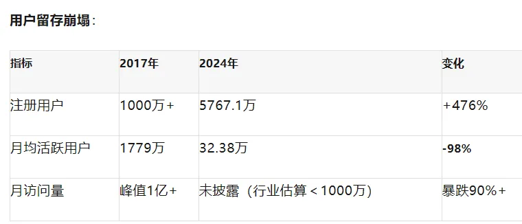 到2024年上半年,月均活跃用户仅剩32.38万,不足2017年1779万月活的零头;