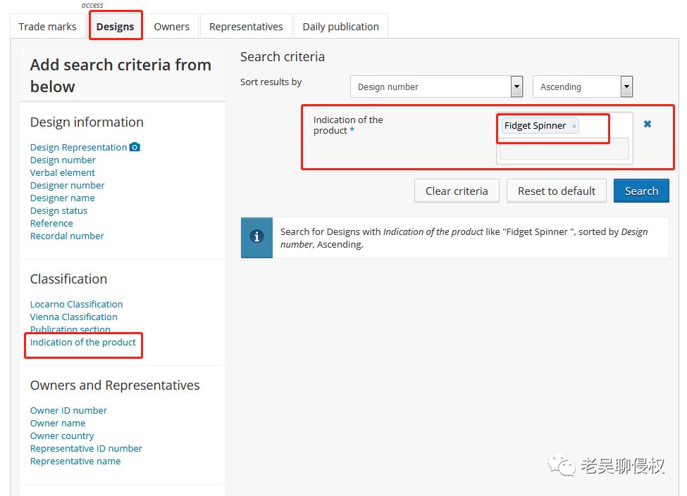 2.选择Designs→Indication of the product→方框内输入关键词“Fidget Spinner ”点击Search就可以检索出相关专利信息。