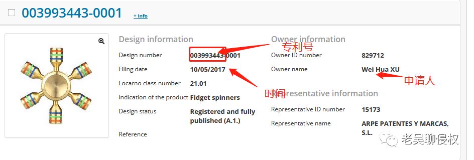 3.下方就是我们要检索的外挂设计详情啦,在这里老吴给大家提个醒商标、专利、版权都具有地域性简单来说就是在哪个国家申请只在哪个国家受保护,欧盟外观设计保护期限是25年。