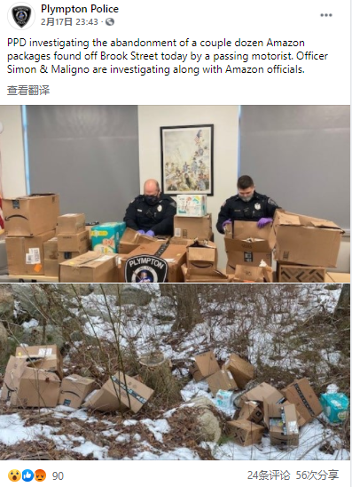 2月17日,美国普林顿警察局发Facebook帖子表示,一个小镇的树林里发现20个亚马逊包裹被丢弃,并表示应该是两三天前被丢弃的: