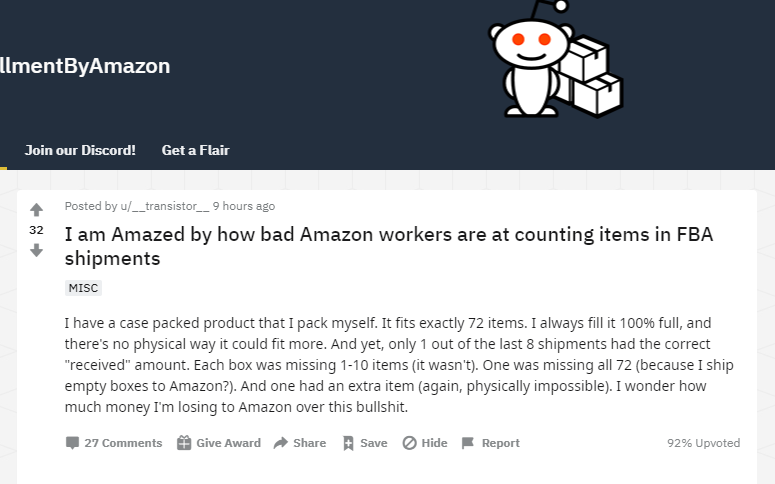 transistor:“我自己打包好了产品,每箱72件,空间全塞满了,没有其他空间可容纳更多产品。但是送到亚马逊仓库的8批货中,只有一批货入库数量和发货数量对的上,其他的总是缺1-10件,其中还有缺少72件的,难道我还能运了个空箱子给亚马逊?还有一批货说里面有其他产品,明显就不可能。我都不知道这回要亏多少钱。”