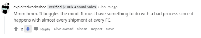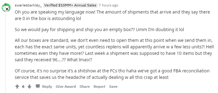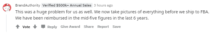 “这对我们来说也是个大问题。现在将货物发往FBA仓库之前,我们会先拍照。在过去6年中,我们已经索赔了几千美元。”