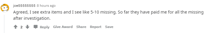 “同意,我遇到过出现其他产品和丢了5-10件货的情况,但经过调查后,亚马逊给我赔偿了。”