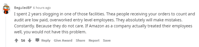 “接收订单并进行数量审核的工人薪资很低,而且工作量超负荷,一般是初级水平的工人。他们很容易犯错误,久而久之也就麻木了。如果亚马逊能够对他的员工好一点,也就没有这些事儿了。”