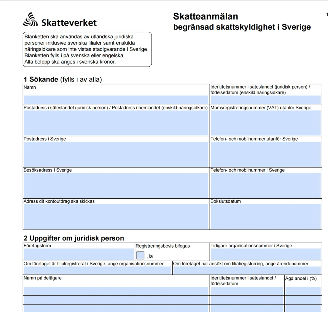 非欧盟企业:通过瑞典税务局(Skatteverket)电子服务系统 RUFS(Registration of foreign companies in Sweden)提交。