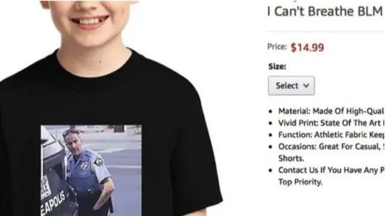 近日亚马逊美国站下架了一款儿童T恤,T恤上印着美国警察跪压黑人乔治·弗洛伊德的图片。