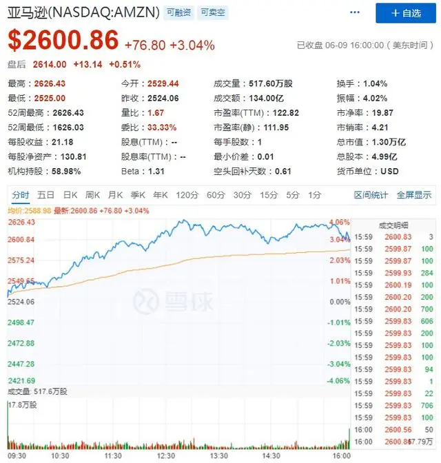 截止昨日美股收盘,亚马逊上涨3.04%,报2600.86美元/股,总市值1.30万亿美元;苹果上涨3.16%,报343.99美元/股,总市值1.49万亿美元。