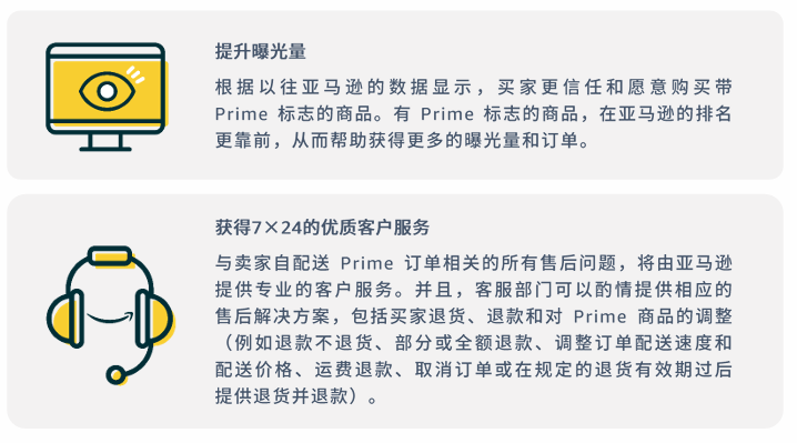 加入卖家自配送 Prime 计划后,您的商品将会有 Prime 标志,从而帮助提升曝光,提高销量,此外亚马逊将帮助您为买家提供7x24小时专业客服。