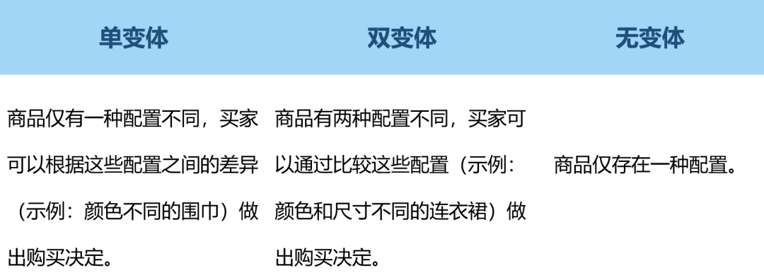 一般来说,商品会有单变体、双变体和无变体三种: