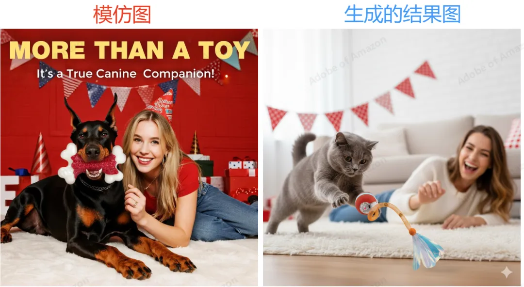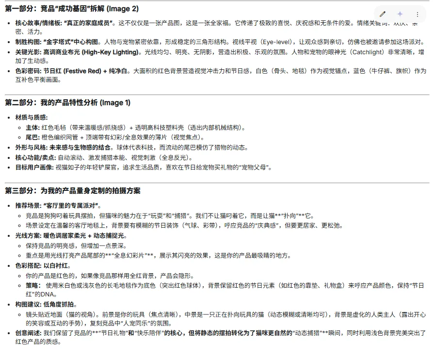 然后把上面猫玩具的产品图和需要模仿的图片+提示词发给AI