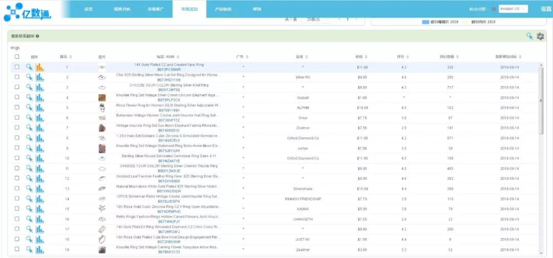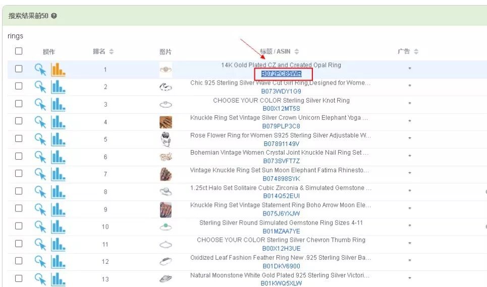 推广“rings”这个关键词的分析,我们可以看到【搜索结果前50】的产品。