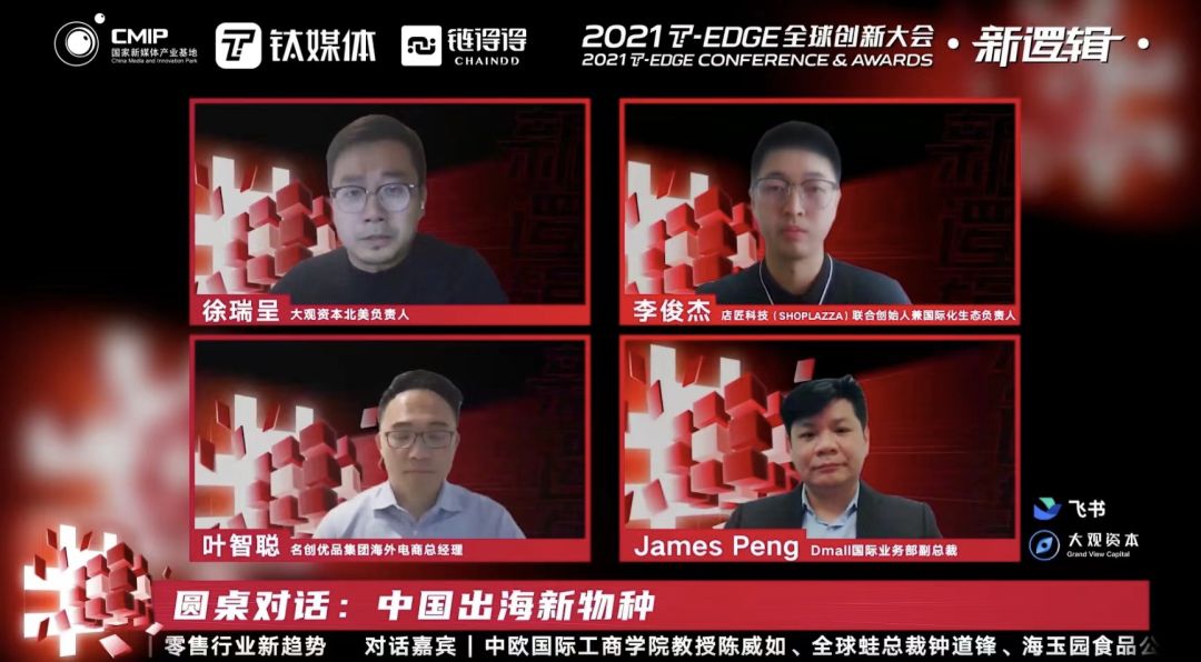 大会以“新逻辑”为主题,关注中国经济在经历过去几十年高速发展之后,底层逻辑正在从过去追求速度和规模向着更加关注公平和可持续方向坚定调整对各产业和资本产生的深远影响,涉及元宇宙、智能制造、AR/VR、跨境电商、自动驾驶等近年的大热领域。在跨境电商这个领域,由大观资本北美负责人、出海同学会主创徐瑞呈 Richer 担任主持人,受邀嘉宾包括名创优品海外电商总经理叶智聪、Dmall 国际业务部副总裁 James Peng 以及店匠科技联合创始人李俊杰,一起对当前背景下,中国品牌应该如何应对未来的挑战等一系列话题进行深度对话。