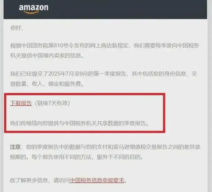 是继2025年10月13日其发布官方通知后的实质性进展。当时亚马逊宣布,将从2025年10月31日起,按季度向中国税务机关报送中国卖家的相关信息。首份报告数据覆盖2025年第三季度(7月至9月)的交易情况。此次邮件中提供的下载链接有效期为7天,卖家需及时保存报告。