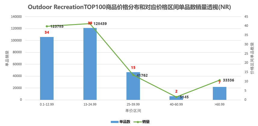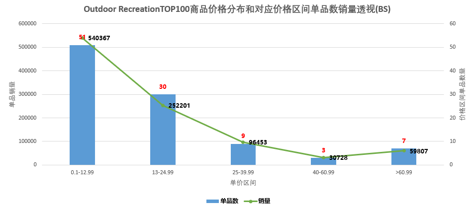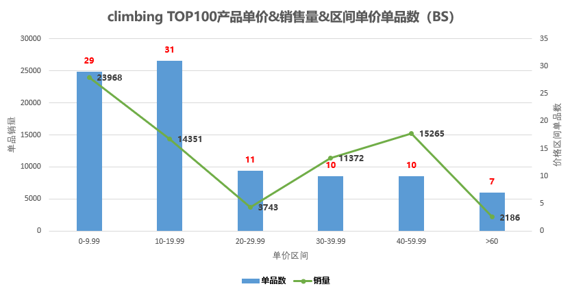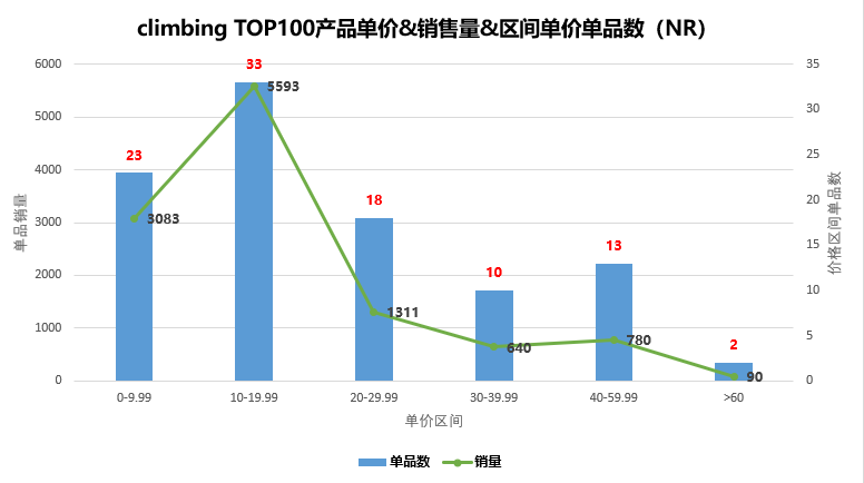 NR中:100个单品中呈现14种产品类型(如下图示)。 此数值较小,侧面反映该类目产品类型不多或总体市场需求有限的态势,老铁们不妨验证下该类目下产品review数,多呈现低于100的评价数。如果把这视为竞争性较小的利好指标的话,个人更偏向是市场需求有限的表达。 在NR中,同BS,登山扣、登山带类型产品占比较高。如若尝试,也更建议走高成本价产品,弱化需求、竞争程度,以安全需求的售后问题作为第一考虑指标。 参考平均售价,Outdoor Recreation、Climbing平均售价与Sports & Outdoors平均售价保持一致,如下图示: 在BS、NR榜单中,售价超过25$的单品,销量总体表现较为弱势,即反应为在Outdoor Recreation类目中定位产品,保证有较高市场需求的同时需要参考此单价,如对把高客单价作为选品的第一要素,Outdoor Recreation类目产品总体匹配度较低。同样,在Climbing类目中,低客单价产品销量占比高的情形更为凸显(如下图示): 高于20$的单品,销量会表现较疲态,不过对于需求的确定是根据每个人的个人需求而言的。故老铁们只作参考,对于单价和市场需求的确定保持你们个人已有的判断准则。这里同等售价产品月估销量Climbing约为Outdoor Recreation类目的4%,有点可怜的样子,与市场供需有关。 销量预估总存在不确定性,排名则更为靠谱。老铁在判定产品或类目竞争性强弱的时候,喜欢把Review数量的多少作为参考依据。review数多,则市场较为成熟,进入难度大。反之,则难度小。个人表示赞同 ,但也保留个人意见。市场需求和竞争性是同时体现,相互关系的,市场需求大的产品,竞争不会小。 在站内数据的分析中,很难发现review基数较小的产品类型。因为review数的多少标志着该类产品市场需求的大小,而对于Best Sellers榜单类目review数的统计,得到的结果往往都是大于500条review数的产品分布。这时候统计该类目商品评价数的多少的象征性意义,变得较为薄弱了,一般是平均1500条评价和平均500条评价的跨度对比才会有意义。