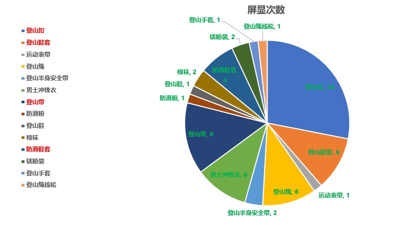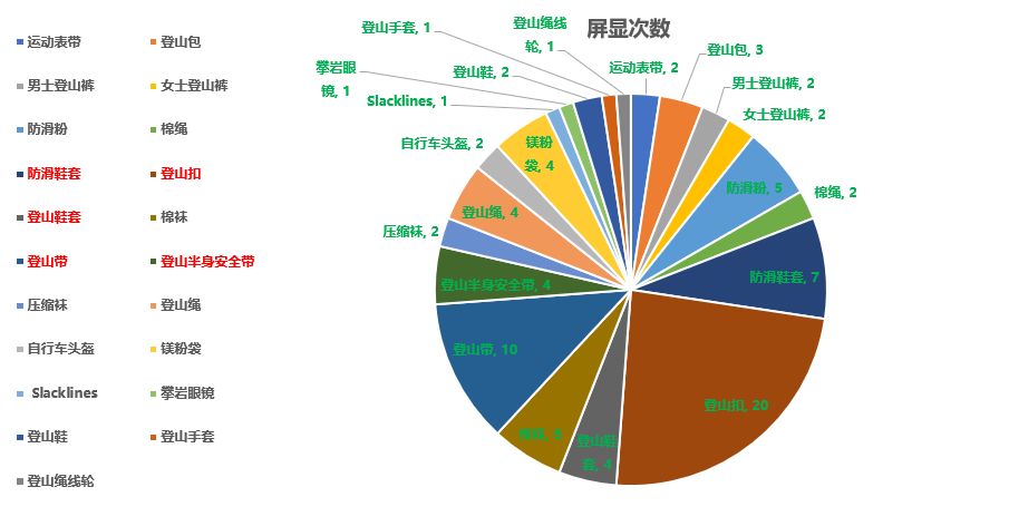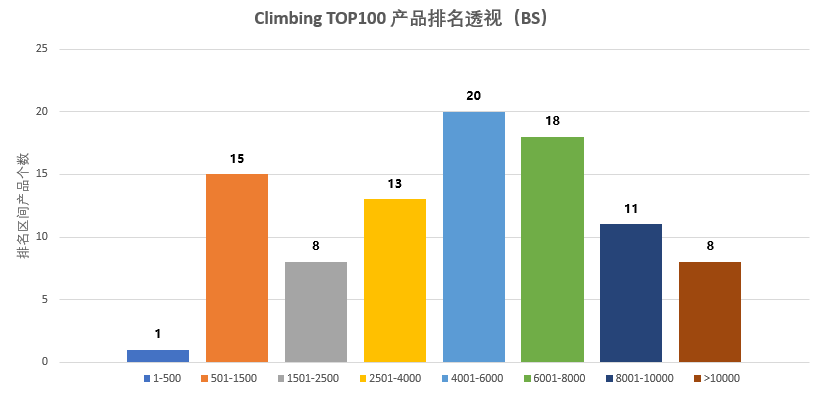 因为二级类目编排太少,今天就以Climbing类目简单呈现吧,如下图示: BS中:100个单品中,呈现21种产品类型,基本涵盖该类目下的主要产品类型。未上榜产品多为以上产品的其他表现形式,因功能、受众人群不同等因素有所区分。 个人对于该类目产品是较为敬畏的,总有一种售后风险极高的危机感,我想这也是朋友们不敢于尝试该类产品的原因之一。 登山扣中锁定、非锁定、快扣还是有着不安全感,类似登山带、半身安全带等产品希望老铁们慎重考虑,可适当选取非攀岩所需关系人身安全的产品作为目标产品较为适宜,镁粉袋、冬季登山鞋套(护腿)等产品就安全系数来讲较为稳妥。