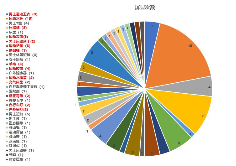 产品类型包含运动器材、衣物、鞋服帽等,带电产品极少。故该类目产品进入门槛较低,物流运输难度较小。 而在这其中表带、水杯、压缩袜、雨伞等产品占比达到4%以上,属较为红海类产品。如对市场需求较大的产品有执着追求的老铁,对上述几款产品请慎重对待。 对于袜类、运动速干衣裤类产品,朋友们不妨可以保持一定关注,对于Best Sellers榜单的日常浏览,保持TOP100产品的更新关注,不失为一种稳健的选品方法。总之那句话:你的产品终究要回归到平台售卖,也尽量别做第一个吃螃蟹的人。