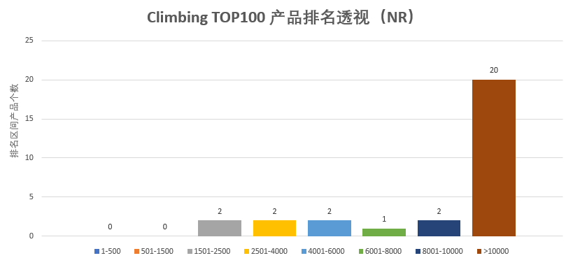 故在BS榜单中,评判类目竞争性的时候,评价数的多少参考意义并不大,市场成熟度可作为一般性考量。但对于落实到具体产品类型的时候,就变得极具有意义。 这里个人选择了类目排名即rank来作为参考,Climbing中,位于rank≤500范围中,只有一个单品,501-1500的单品数为15个,因二级类目只有三个。 故在此类目中的定位可视为其他类目中的二级类目,rank<10000的单品数为86个,总体市场表现不如home、Electronics等类目的某一种产品类型故老铁在选择此类目进行产品时,期望值别太高,进入大类1500难度较大。 在NR中:rank<10000的单品为9个。 此处单品基数越大,也客观反映总体市场需求或容量较大,对于类目和单品的判定均可以此作为一个参考项,上述的所有列项都在诠释着Climbing的“穷酸潦倒”,如若进入,请朋友们做好心理准备,无知无畏,岂能全身而退。