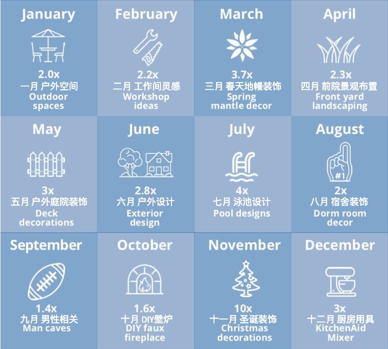 据CHASE和Pinterest在2018年联合发布的一份报告[8]也显示,家庭及庭院品类在全年12个月都有很强的季节性特色,每个季节都有不同的庭院商品需求,一旦进入这一品类的销售旺季,需求量会比平时增长数倍。