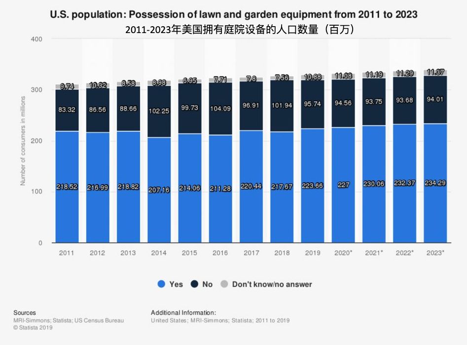 美国庭院品类在2017年的零售额达478亿美元,呈逐年上涨趋势,预计2020年将增长至570亿美元[1]。西欧国家家庭与庭院产品销售额在2020年预计达到2529亿欧元[2]。