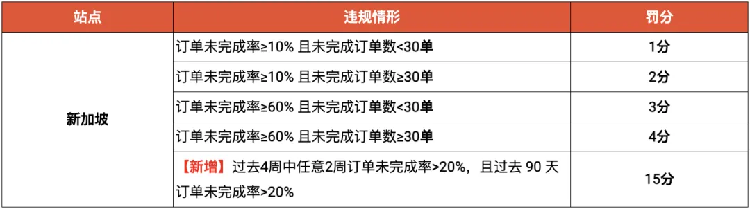 据 Shopee 消息,为保障买家体验,自北京时间 2025 年 12 月 8 日起,Shopee 新加坡站点将新增订单未完成率罚分标准:对于过去 4 周中任意 2 周订单未完成率超过 20%,且过去 90 天订单未完成率超过 20% 的卖家,将额外扣除 15 分。