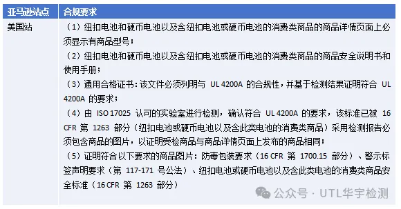 亚马逊要求所有含纽扣电池或硬币电池且属于 16 CFR 第 1263 部分适用范围的消费类商品,均需经过测试并符合16 CFR 第 1263 部分标准和UL 4200 A标准,含纽扣电池的消费类商品包括但不限于:计算器、照相机、无焰蜡烛、闪光服装、鞋靴、假日装饰品、钥匙扣手电筒、音乐贺卡、遥控器和钟表。(纽扣电池:直径通常为 5 至 25 毫米、高度介于 1 至 6 毫米的扁圆形电池。)