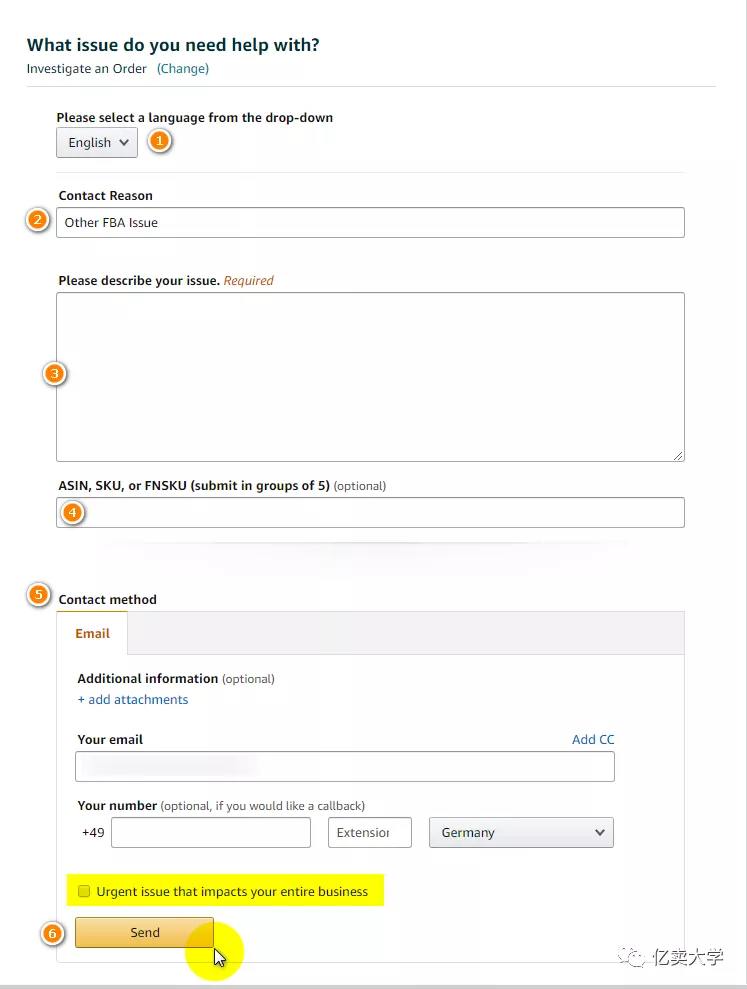 STEP 4 选择沟通语言–填写问题内容&信息-点击“Send“发送
