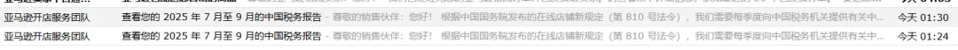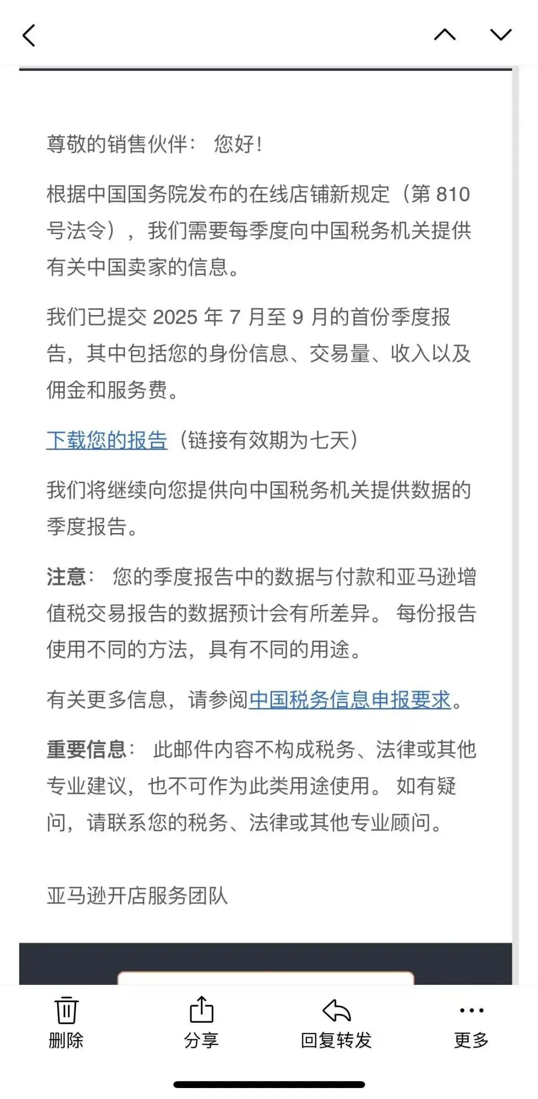 今天凌晨,不少亚马逊卖家都收到了一封邮件,标题是:“查看您2025年7月至9月的中国税务报告”。