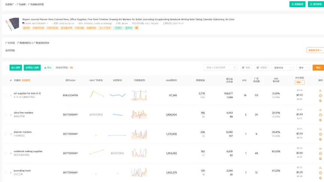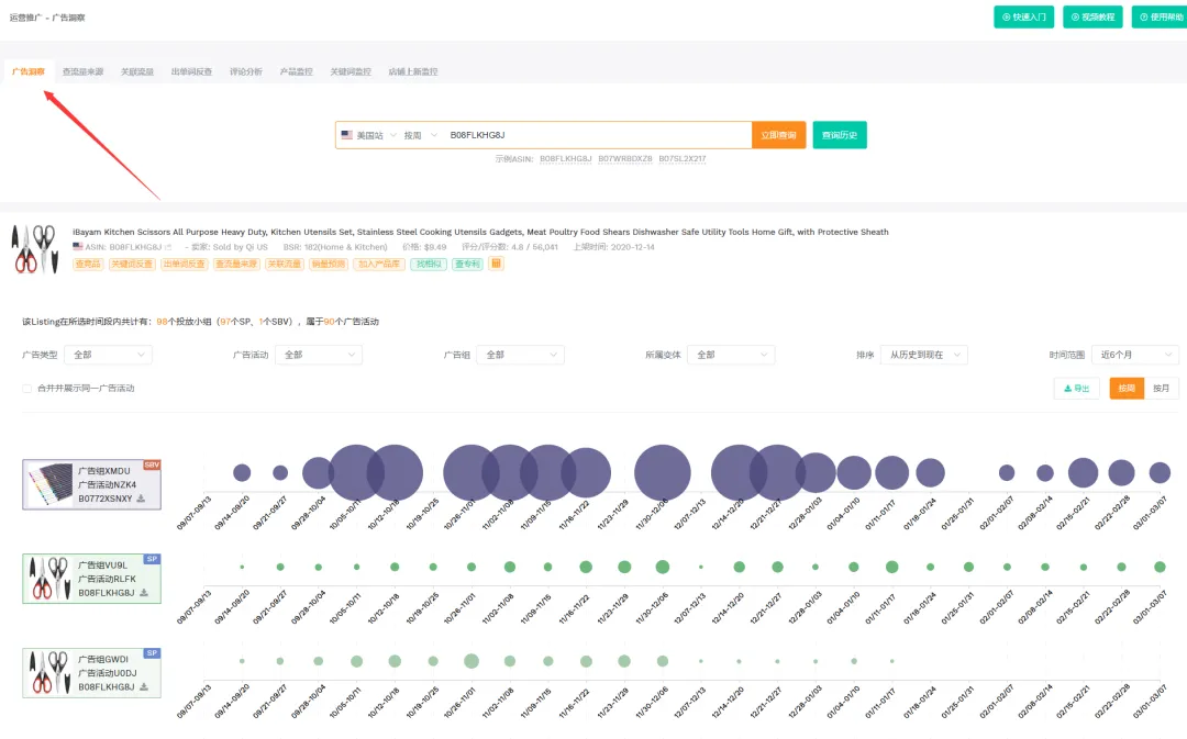这里可以用卖家精灵的“广告洞察”功能,输入竞品ASIN,查看它们的主要广告投放词,广告类型,广告位,PPC竞价,关键词趋势等,尽可能找到对自己最精准有利的关键词和广告类型进行投放。