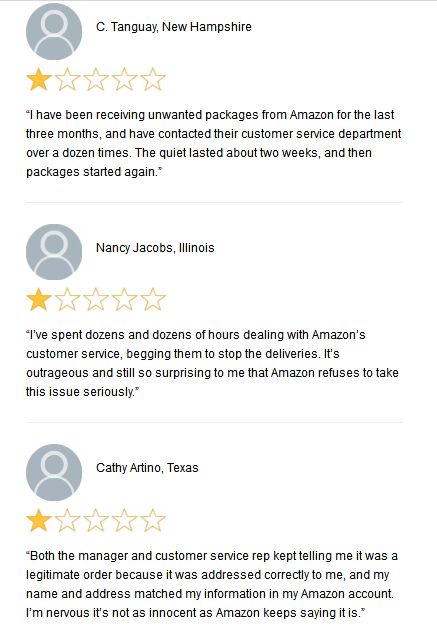 “过去三个月,我一直收到来自亚马逊的不需要的包裹,并且已经和他们的客服部门联系了十几次。然而只安静了大约两周,这些包裹就又来了。”
