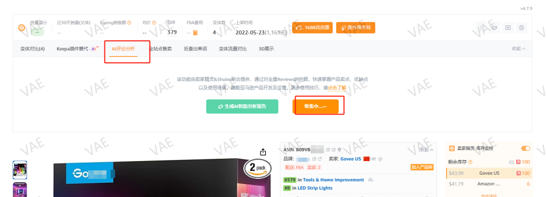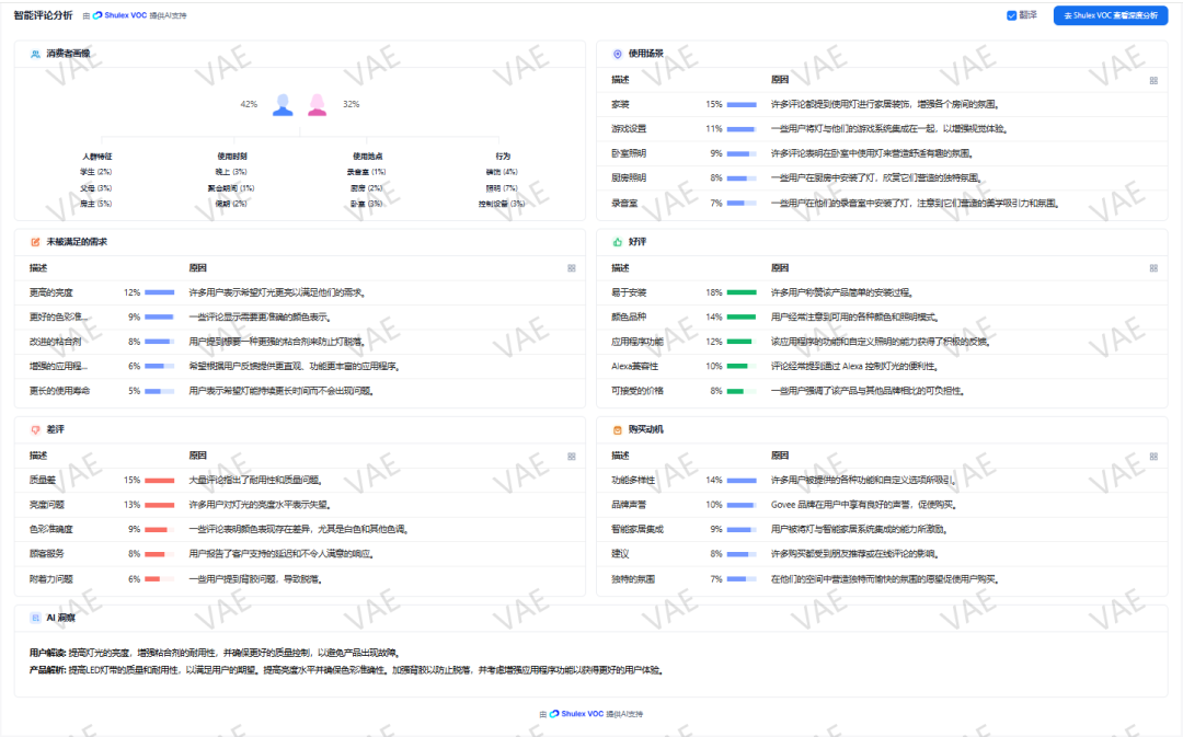 在Listing详情页面的插件,点击AI评论分析,几分钟后即可生成报告。就可以查看到整个产品的所有评论,以及卖家精灵对于产品的人物画像、使用场景、未被满足的需求、好评和差评、购买动机等的总结信息。