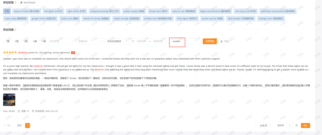 比如人群特征显示有学生,我们就可以去评论那里搜student,school等相关属性的关键词。分析评论,找到用户的需求点。