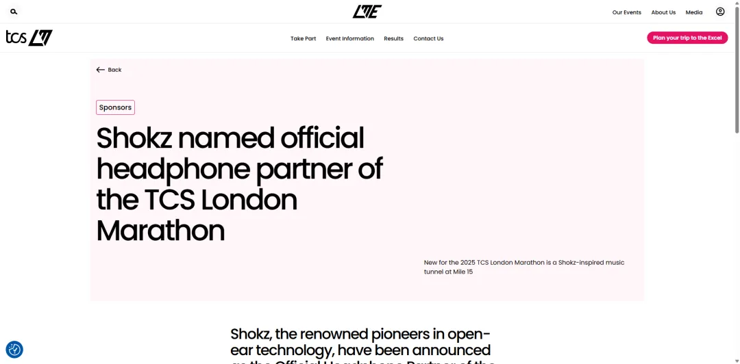 在伦敦马拉松的官方训练内容页,Shokz的内容没有讲“骨传导技术”,而是直接描述了一个跑者能瞬间理解的场景:“开放式耳机让跑者在像伦敦马拉松这样的赛事里,可以同时体验现场氛围和自己的播放内容。”