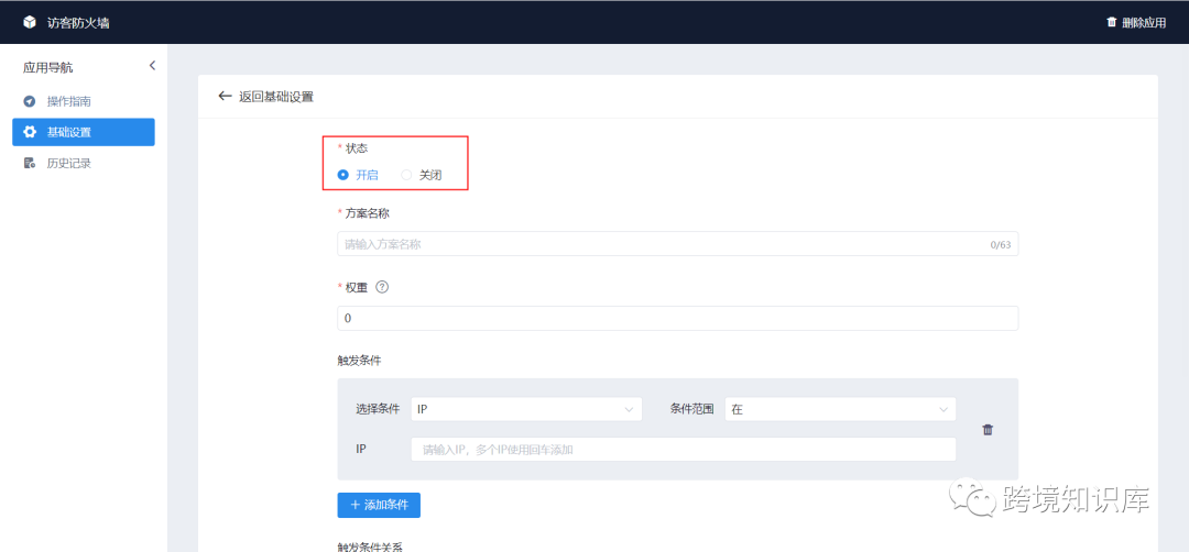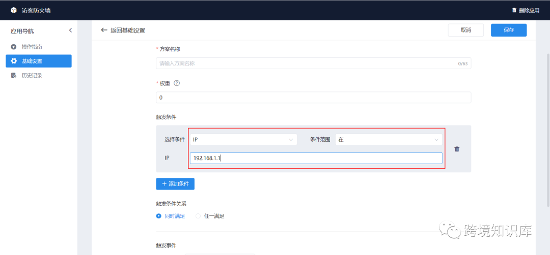 触发条件①:IP;格式可区分为多种,具体请根据业务需求填写,例如格式中的其中一种为“192.168.1.1”当此IP访问时,需判断“条件范围,选择【在】立即触发防火墙;选择【不在】除了此IP以外的其他任何IP(如“192.168.200.200”)访问都会立即触发防火墙”