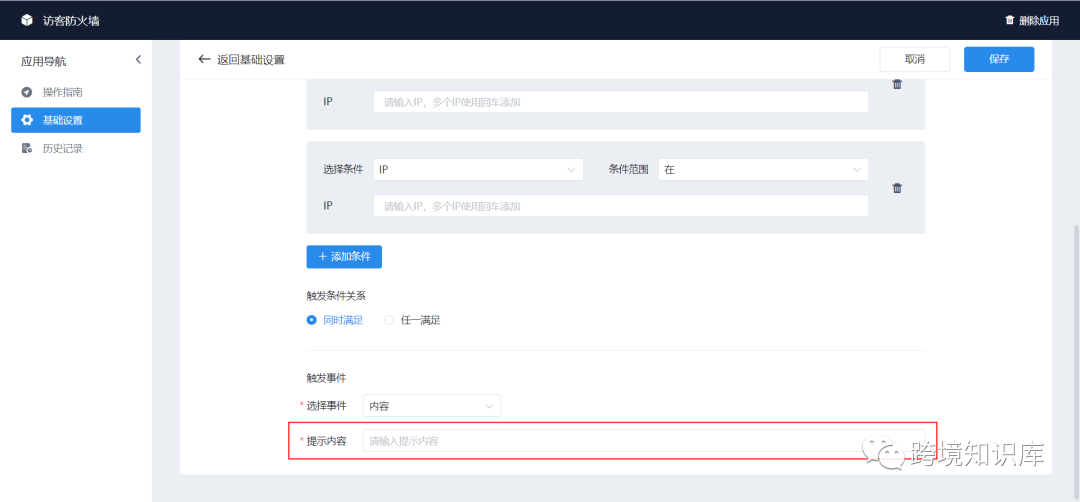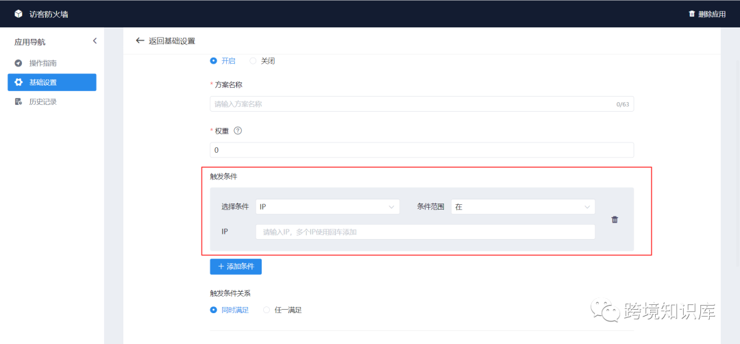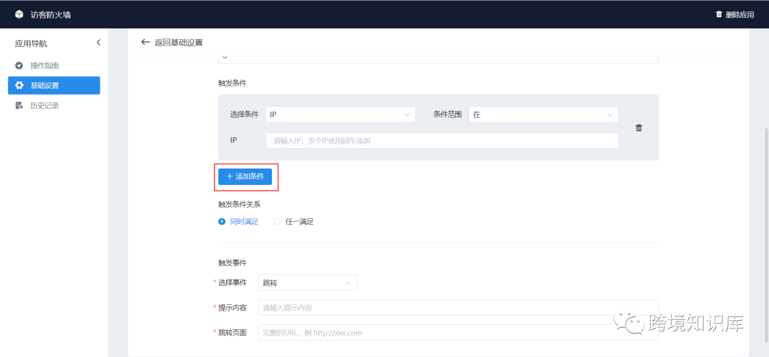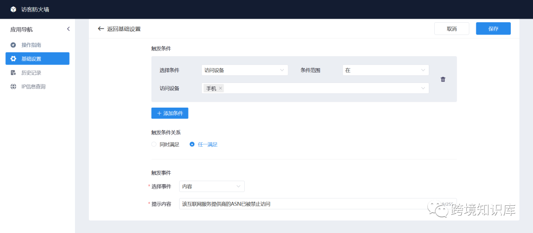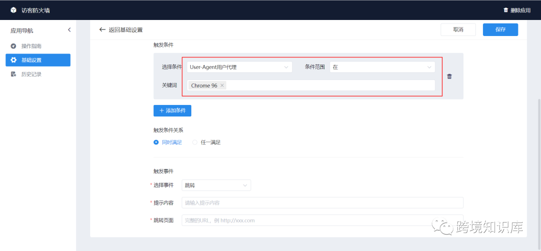选择“触发条件关系”为【同时满足】时,需所有已配置的“触发条件”都符合才会触发防火墙;为【任一满足】时,只需其中一种“触发条件”符合就会触发防火墙
