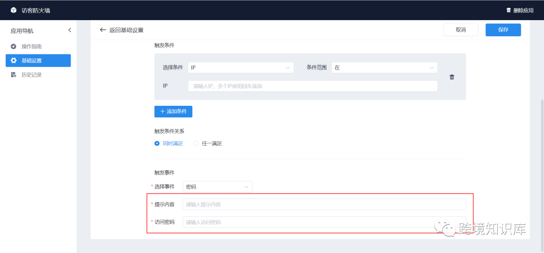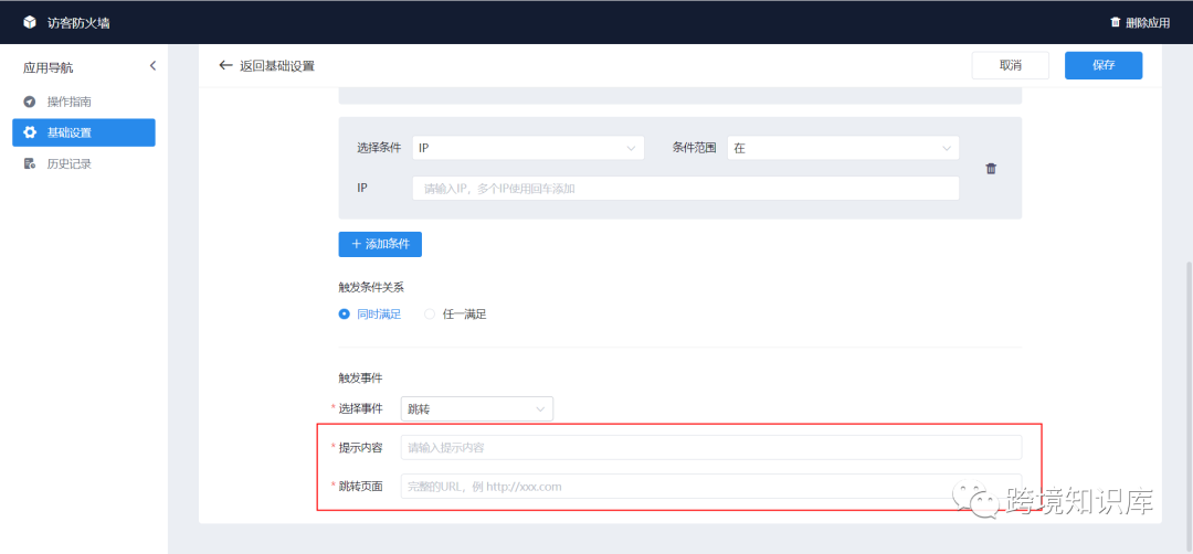 触发事件即触发防火墙后的效果;可分别选择事件为:跳转、内容、密码