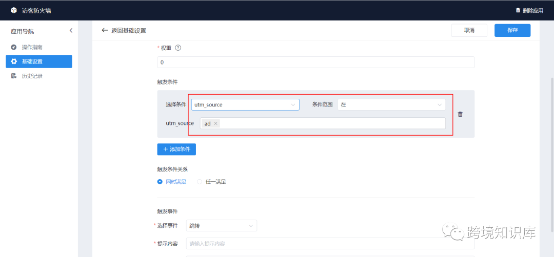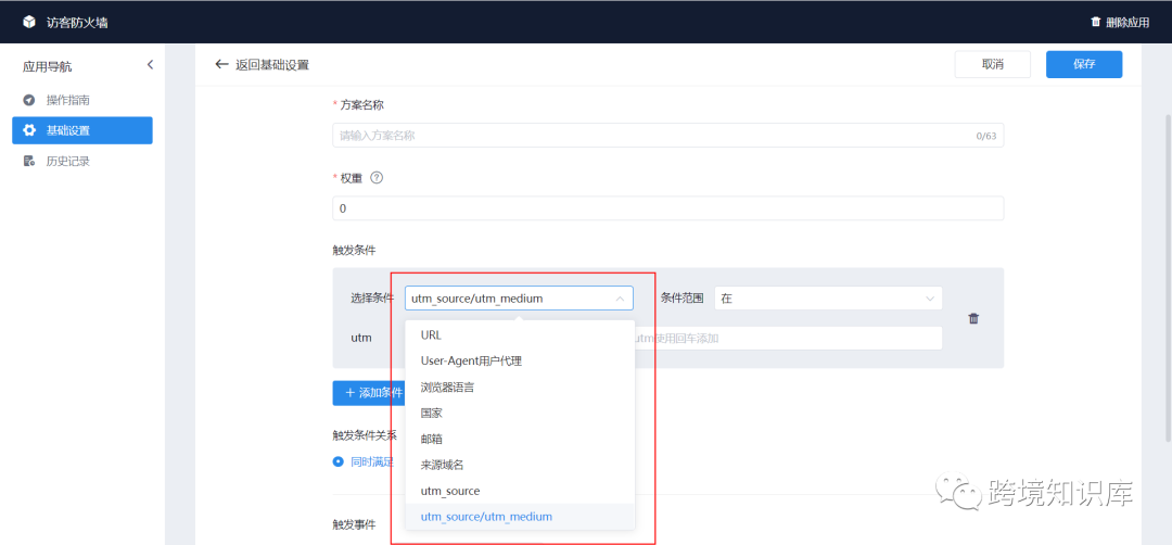 触发条件⑨:utm_source ;限制某个来源域名所包含的参数,可输入多个,例如“https://www.google.cn/page?utm_source=ad”将作为判断依据,限制参数为utm_source=ad访问时的任何来源域名,同时需判断“条件范围,选择【在】的情况,任何包含此参数的来源域名跳转访问本站,则立即触发防火墙;选择【不在】的情况;除此参数外其他任何来源域名携带的任何参数跳转访问本网站时(如“https://www.baidu.com/page? utm_source=qq”),都立即触发防火墙