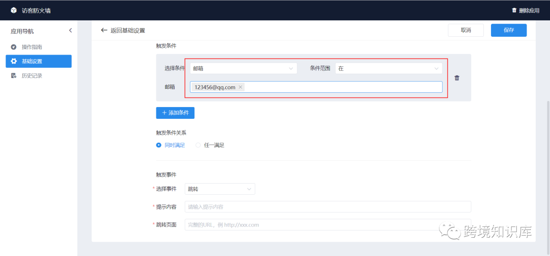 触发条件⑦:邮箱;限制某个邮箱,可输入多个,例如“123456@qq.com”将作为判断依据,限制此邮箱的访问(包含使用此邮箱注册的会员以及使用此邮箱作为收货信息),同时需判断“条件范围,选择【在】的情况,此邮箱访问时,则立即触发防火墙;选择【不在】的情况;除此邮箱外的其他所有(包含以此邮箱注册的会员以及使用此邮箱作为收货信息)访问时,都立即触发防火墙
