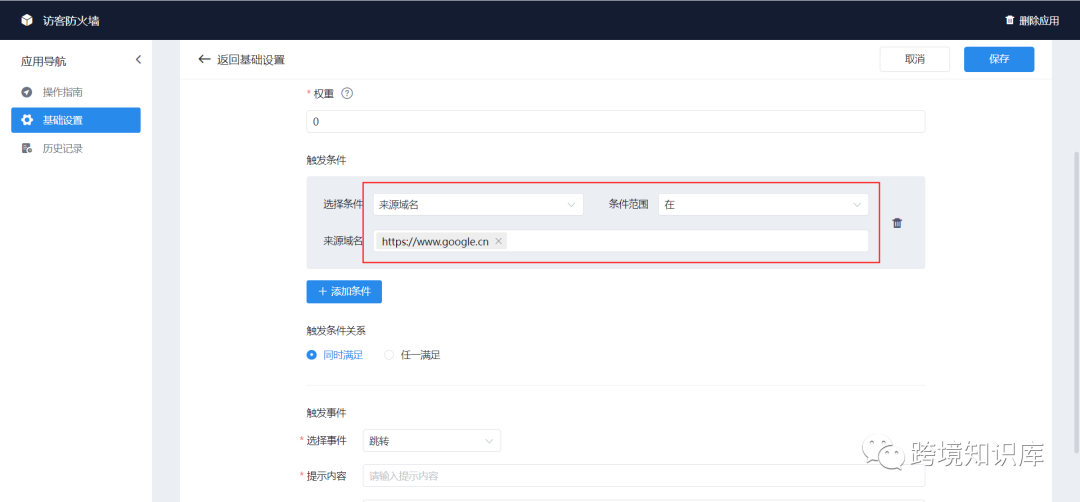 触发条件⑧:来源域名;限制某个来源域名,可输入多个,例如“https://www.google.cn”将作为判断依据,限制此域名跳转访问本网站时,同时需判断“条件范围,选择【在】的情况,此域名跳转访问本网站时,则立即触发防火墙;选择【不在】的情况;除此域名跳转的其他所有域名跳转访问本网站时(如“https://www.baidu.com”),都立即触发防火墙