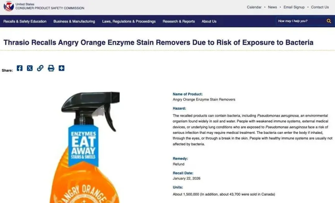 根据CPSC的报告,Thrasio在亚马逊上的旗舰品牌Angry Orange,一款热门的Enzyme Stain Remover(酶去污剂)产品,由于含有可能让免疫系统面临严重感染风险的细菌,被勒令召回,召回数量高达150万件!