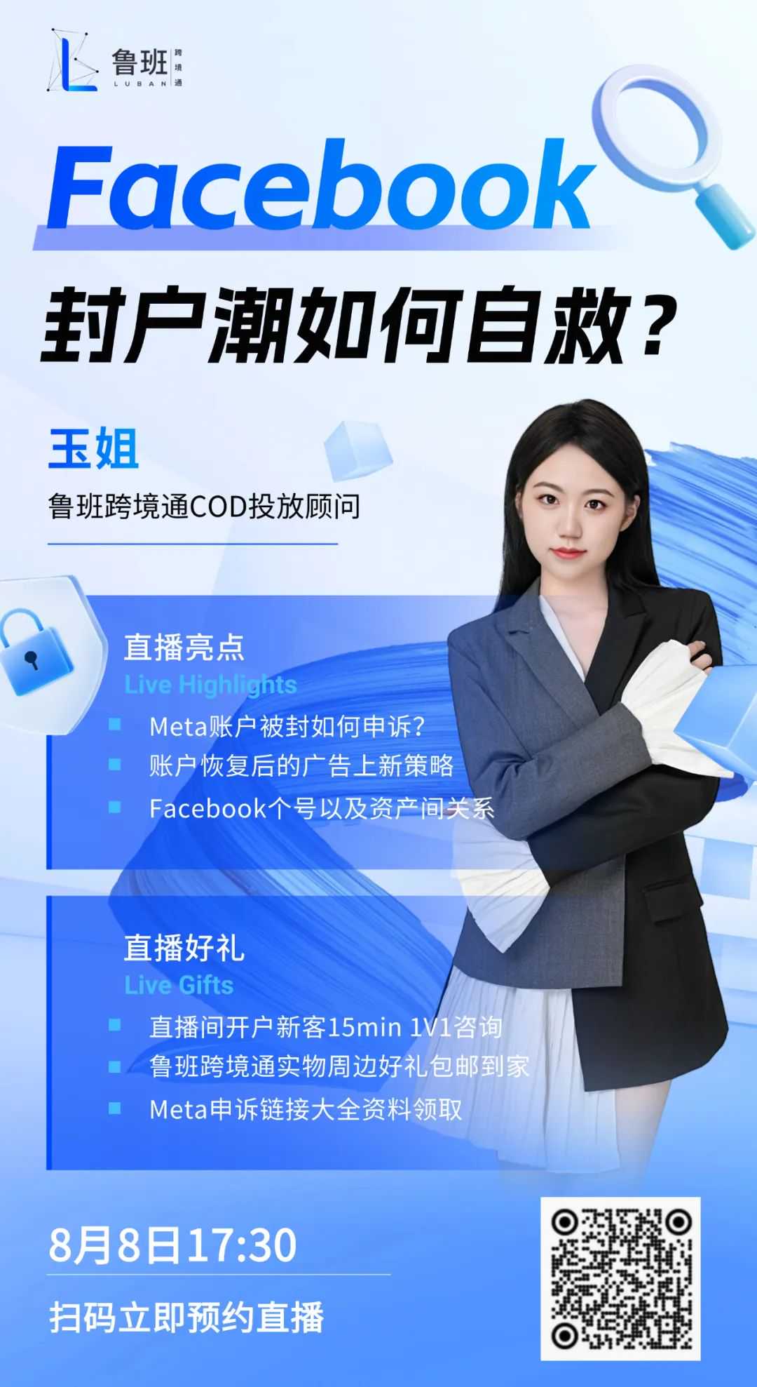 更多Meta最新政策、防封技巧以及申诉指南可以点击文末“阅读原文”私信小助手领取哦,也可以锁定本周四17:30鲁班跨境通直播间,玉姐在线答疑,助您广告无忧!点击卡片立即预约直播!更多广告投放干货以及精彩好礼不容错过!