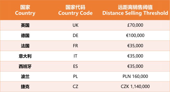 2、在当地国家无库存,从其他欧盟国家远距离销售到该当地国家的一年销售额超出该国远距离销售阈值(各国远距离销售阈值如下表所示)。