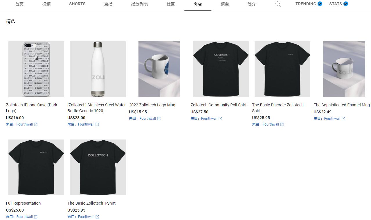 [商店]:顾名思义,开店销售东西,大致查阅了几位大小老美博主,都是挂着自己的周边产品,作为跨境卖家,我知道你现在在想什么!答案是门槛不低,首先要有1000订阅者+4000小时的观看量才能开启[创收]的功能,之后才能进入到[商品]页面去关联自己的shopify店铺,况且还有地域限制。具体规则点这里。