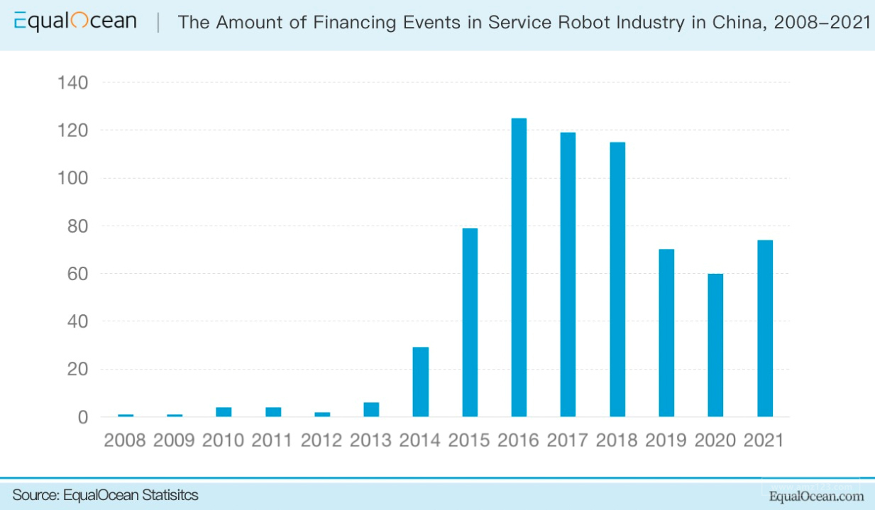 从融资的角度来看,服务机器人已然成为了一种投资热。2021年,行业内发生80多起融资事件。在 2022 年上半年,服务机器人公司完成了 42 项融资项目,在机器人行业的细分市场中名列前茅。据IFR统计,2018-2021年中国服务机器人市场实现持续增长。2021年市场规模超过302.6亿元,同比增长36.18%。可以肯定地说,该行业已进入快速增长阶段。