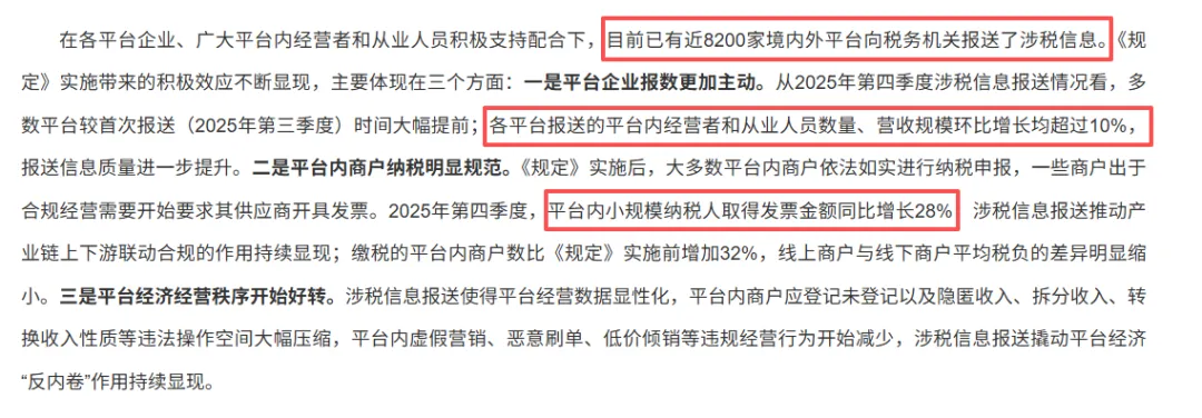 《互联网平台企业涉税信息报送规定》落地已经半年多,税务总局在最新发布会上透了底:全国近 8200 家平台企业,都按规完成了涉税信息报送。