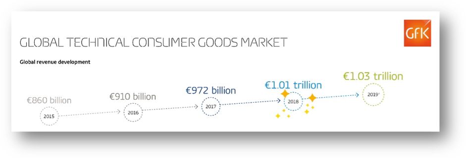 德国市场调研公司GFK最近的数据表明,2019年全球技术类消费产品的市场规模将达到空前的1.03万亿美元。