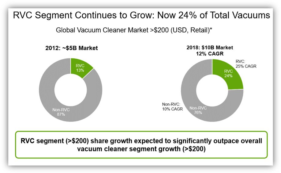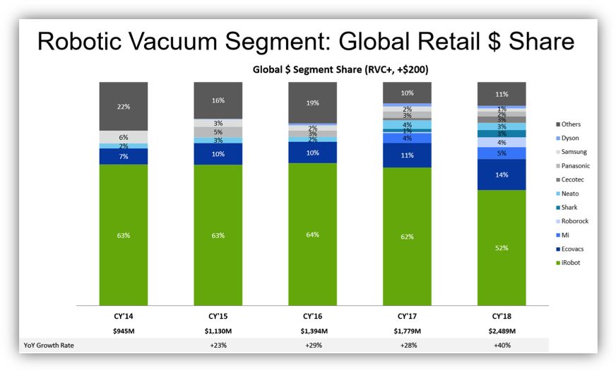 全球业界领先品牌irobot在今年6月发布的年度投资人报告中称,全球真空吸尘器在2018年已经达到100亿美元的市场规模,其中扫地机器人占据24%的份额;而扫地机器人的年均复合增长率高达25%。