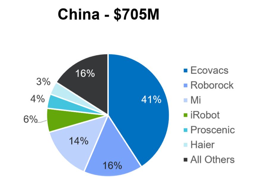 中国是仅次于美国和欧洲的第三大扫地机市场。中国品牌在国内拥有极大的优势,占据超过80%的份额。在全球其他市场拥有压倒性优势的irobot在国内仅占据6%的市场份额。相信科沃斯、小米、石头、Proscenic、海尔以及一众中国品牌扫地机器人在未来有机会参与更多的国际竞争。