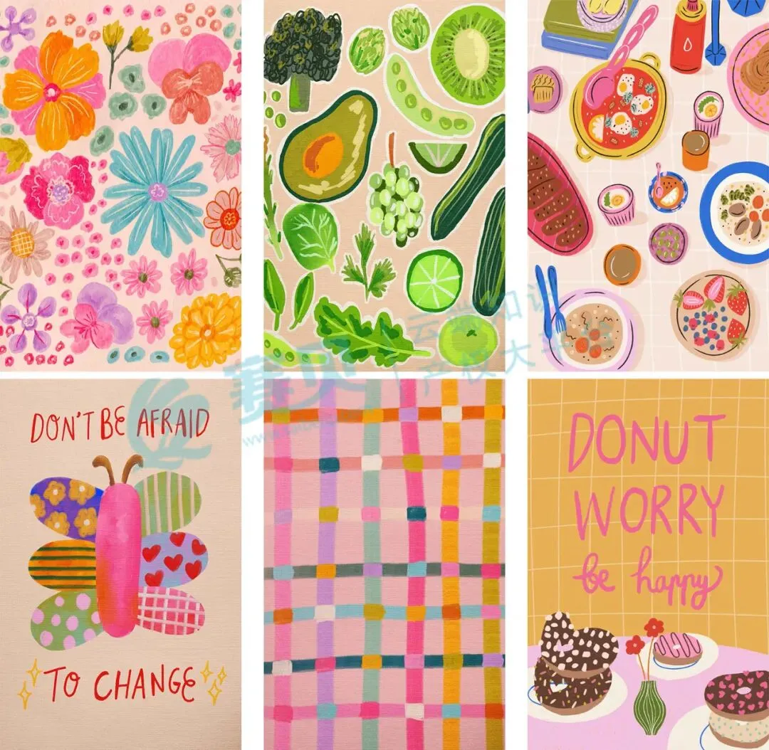 Kartika Paramita是印尼的资深插画师,还是个表面图案设计师,主打 “色彩鲜明、maximalist(极繁主义)” 风格,作品主要围绕风景、美食、励志语录这三大核心主题,特别会用丰富的色调打造出很有视觉冲击力的作品。从2013年就开始做专业插画了,早期用的是水彩、水粉这些传统媒介创作,后来慢慢转型做数字艺术,专门研究季节性家居装饰类的插画。