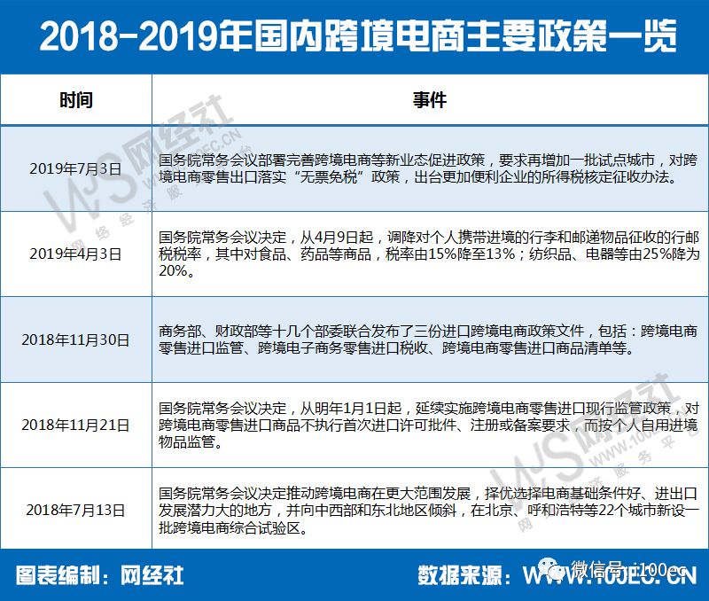 2019年7月3日,国务院常务会议部署完善跨境电商等新业态促进政策,要求再增加一批试点城市,对跨境电商零售出口落实“无票免税”政策,出台更加便利企业的所得税核定征收办法。